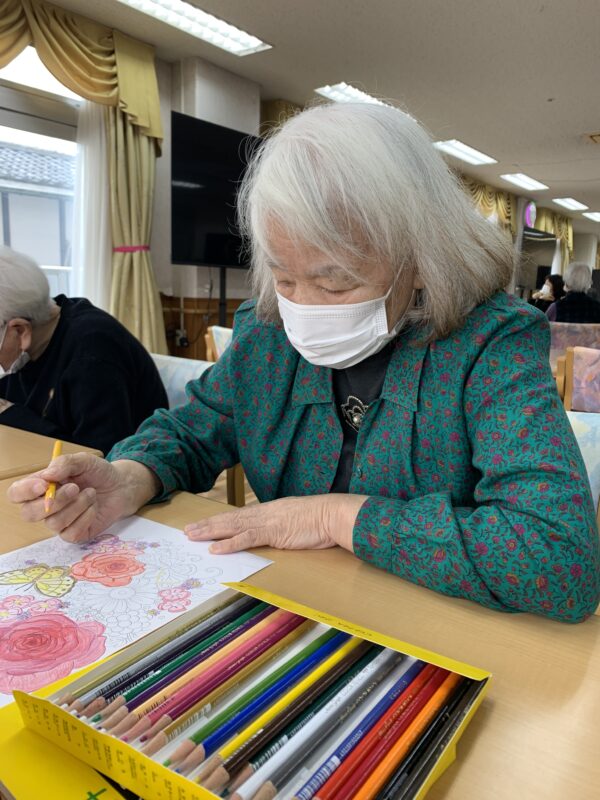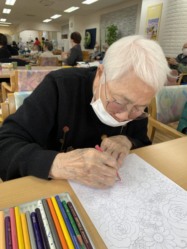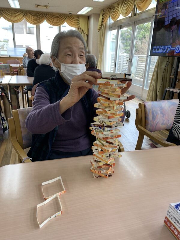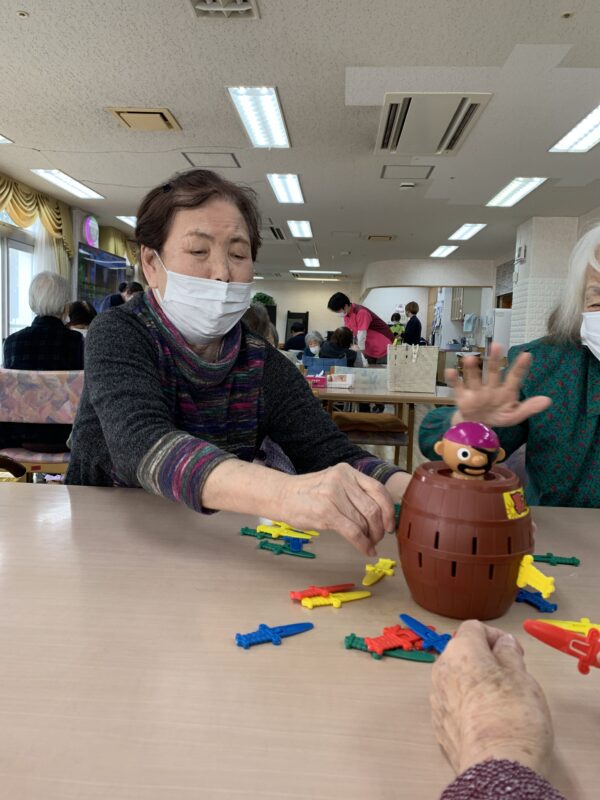 今日も、頭も体もたっぷり使う一日となりました☆パズルや将棋崩し、黒ひげ危機一髪、グラグラタワーなど様々な脳トレに挑戦し、笑い通しの時間になりました。コロリアージュでは、思い思いの色を選びながら集中して取り組まれ、作品を見せ合う姿が印象的でした♪また、輪っか体操でしっかりと体を動かし、気分もスッキリされたようです!考える楽しさ、作る喜び、動く心地よさを感じて頂けた一日となりました☆