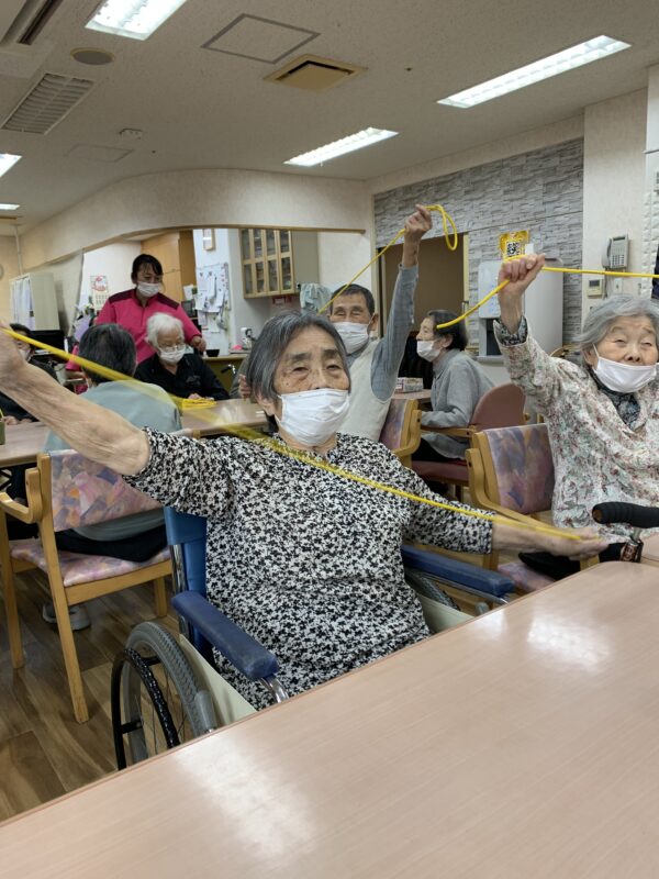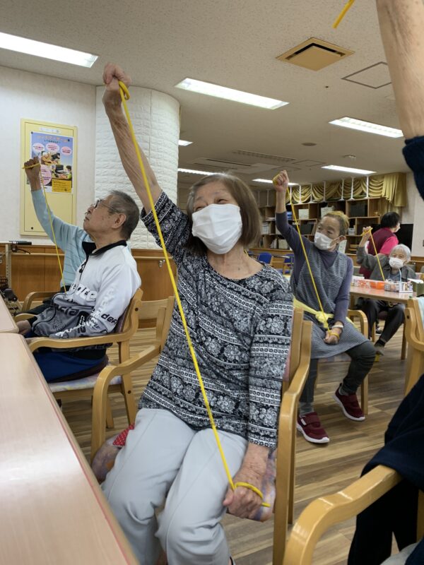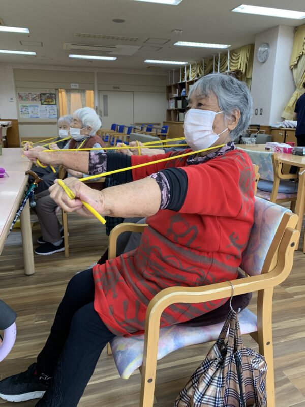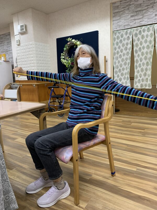 本日の、気温は最高で19℃。昨日よりも5℃ほど低く、ぐっと秋の深まりを感じる一日となりました。最近、背中が丸くなりやすい方も多くみられるようなので、姿勢をテーマにチューブ体操を行いました。胸を広げたり、背筋をグーーーーっと伸ばしていただきました!