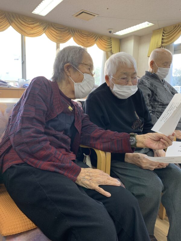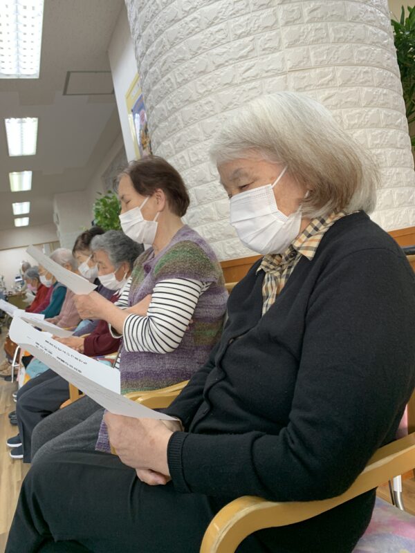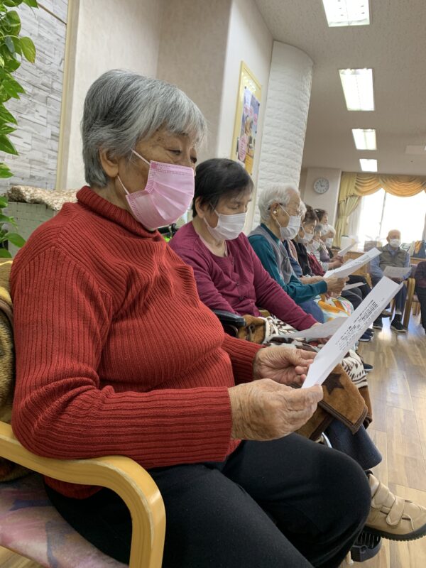 本日の音楽療法での話題は、「思い出の1ページ」でした。皆さんから伺ったお話の多くは、青春時代の恋愛エピソード。懐かしい曲を歌いながら、当時の思い出を語ってくださる表情は穏やかで、あたたかい時間が流れました。音楽を通して、心が昔にタイムスリップしたようなひとときでした☆
