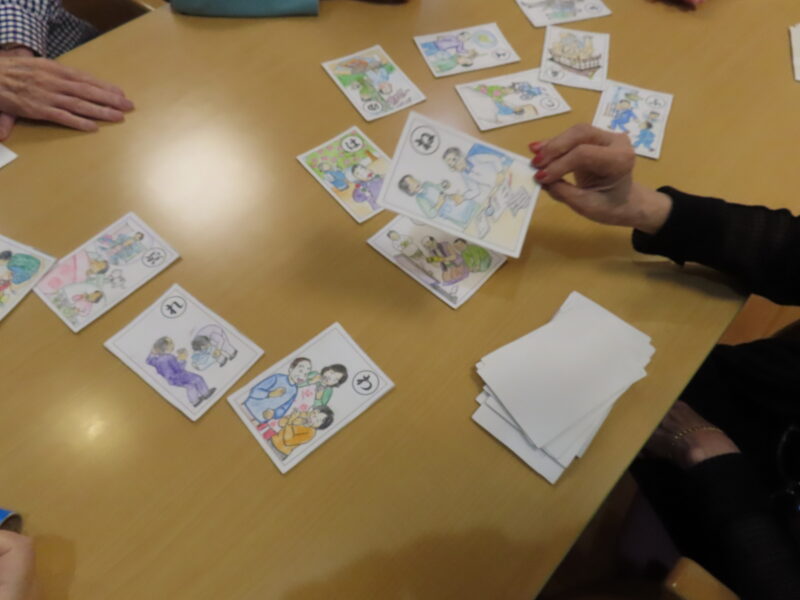 皆様と一緒にカルタを行いました。聞いたことがないことわざがあると皆様でどんな意味だろうねぇ。と考えながら手はしっかり