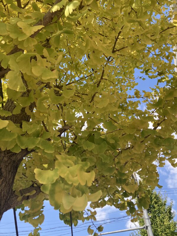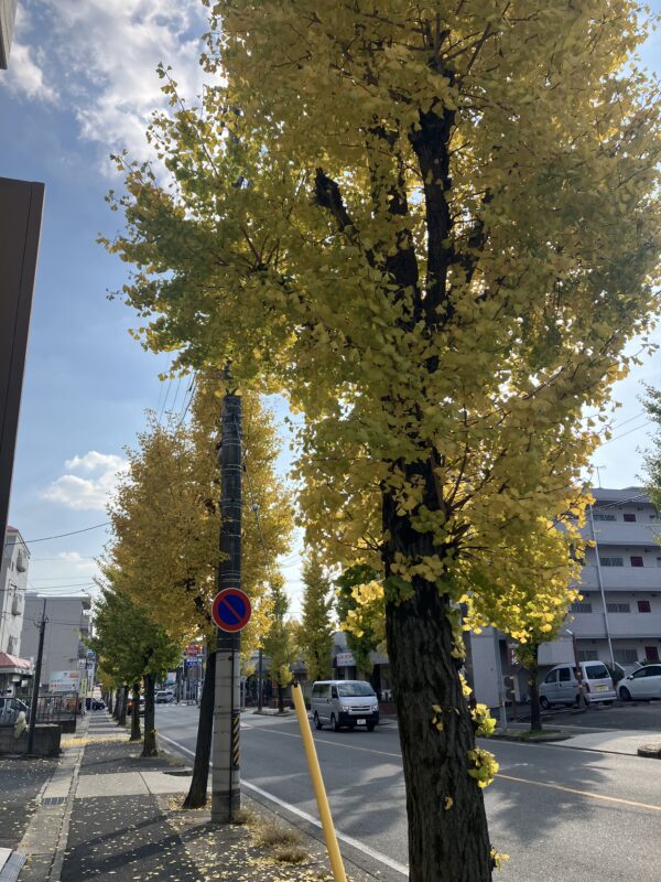 香流川翔裕園前の歩道のイチョウ並木も、日差しを受けて一層キレイです。