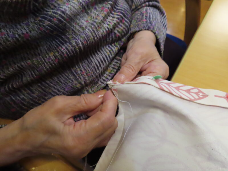 創作のばね口ポーチです、布を裁断され手縫いで仕上げていきますが皆さん丁寧にそしてテキパキすすめておられました。