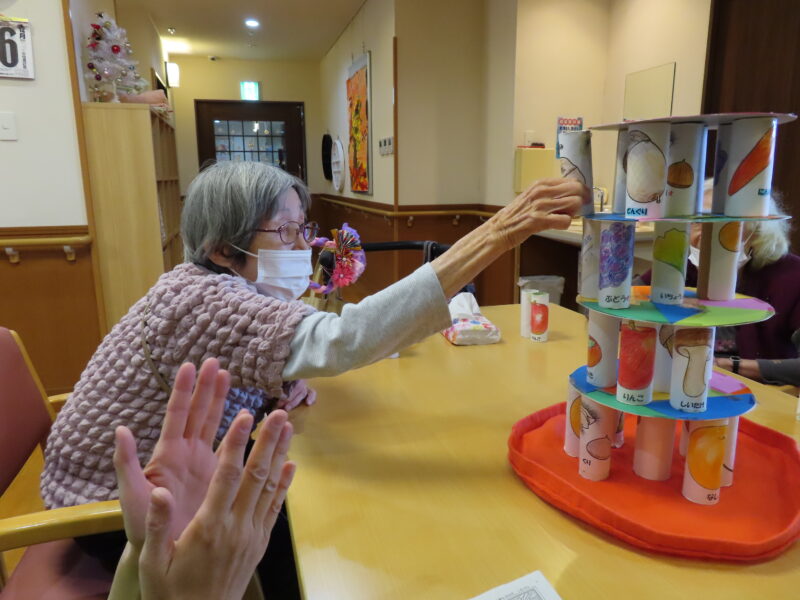 今日は少し寒さが和らぎましたね。久しぶりにフルーツジェンガをしました。皆様1本、1本慎重に棒を引き抜かれます。