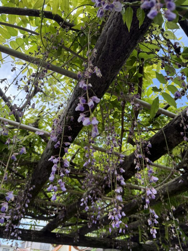 公園に到着すると、甘い香りに包まれた藤棚の下でひと休み。