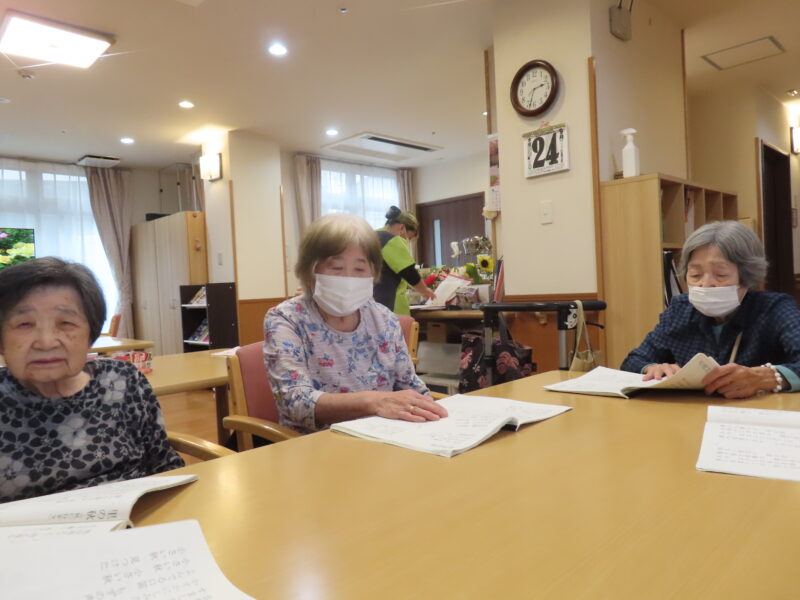 今日は皆様と歌を合唱しました。季節は秋です。里の秋や夕焼け小焼けなど皆様と一緒に歌うときれいな夕焼け空が目に浮かぶようでした。歌はやっぱりいいですね。