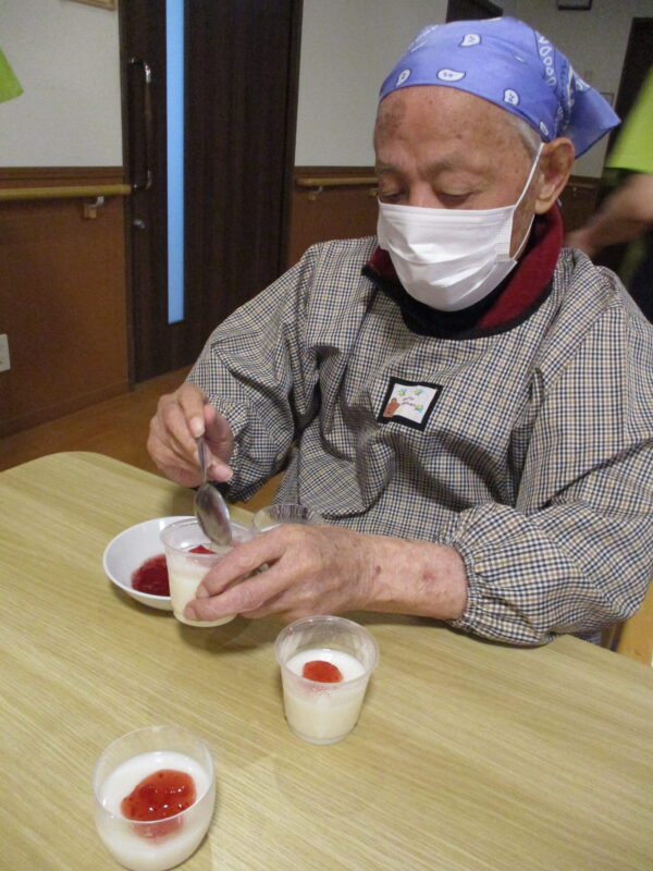 お客様にもお手伝いいただき、とても好評のおやつに仕上げることができました。赤色のソースはイチゴ味です🍓