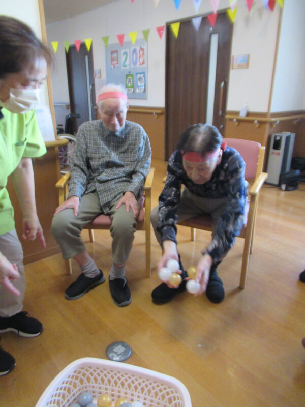 最初の種目は「玉入れ」。カゴを目がけて力いっぱい玉を投げ入れ、熱戦が繰り広げられました。