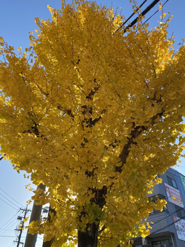 施設前のイチョウです。葉はチラホラ散ってきてますが、まだまだ目を楽しませてくれそうです。