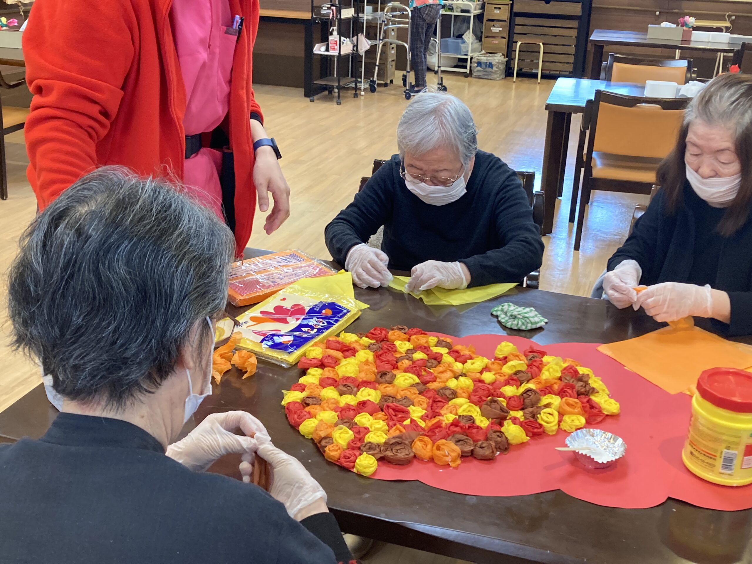 今日は日中暖かく気持ちの良い一日でしたね☀️ 午前元気に体操を行いました🤗 午後は寒椿の作品作りの下準備を皆さんでして頂きました🌺 お話しをしなら紙をクルクルと丁寧に沢山作って下さいました✨[...]
