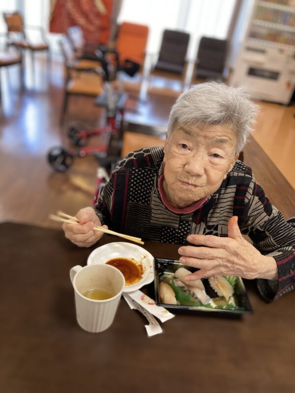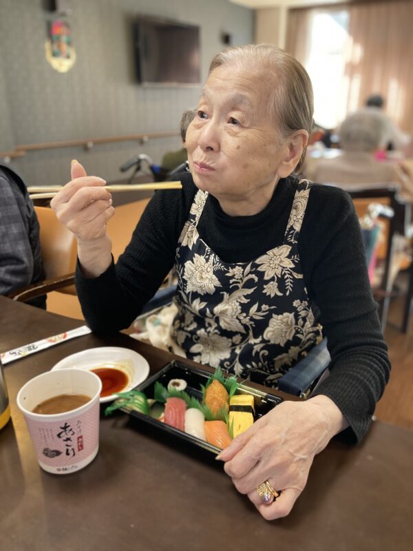 春のような暖かな1日になりましたね。本日はお昼にお取り寄せのお寿司🍣を召し上がりました。皆様美味しい😊と笑顔で召し上がっていました✨