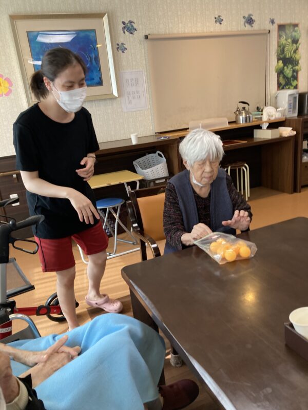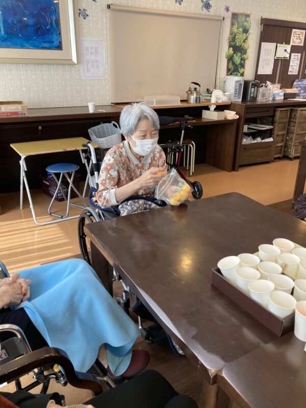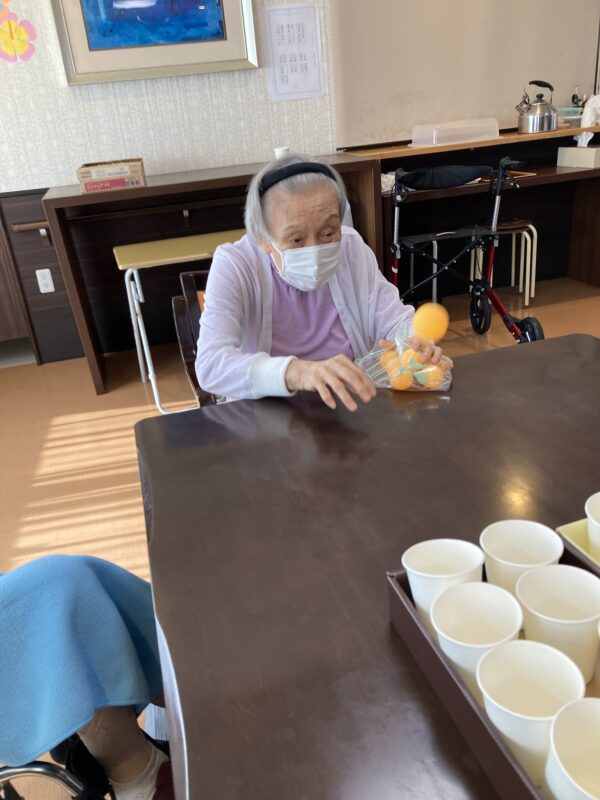 - 今日も暑い日でしたね🥵お客様は変わらずお元気にお過ごしです。本日は午前中は体操をし、午後からは指体操のあとピンポンカップというゲームを行いました。皆様元気に楽しく過ごしました。