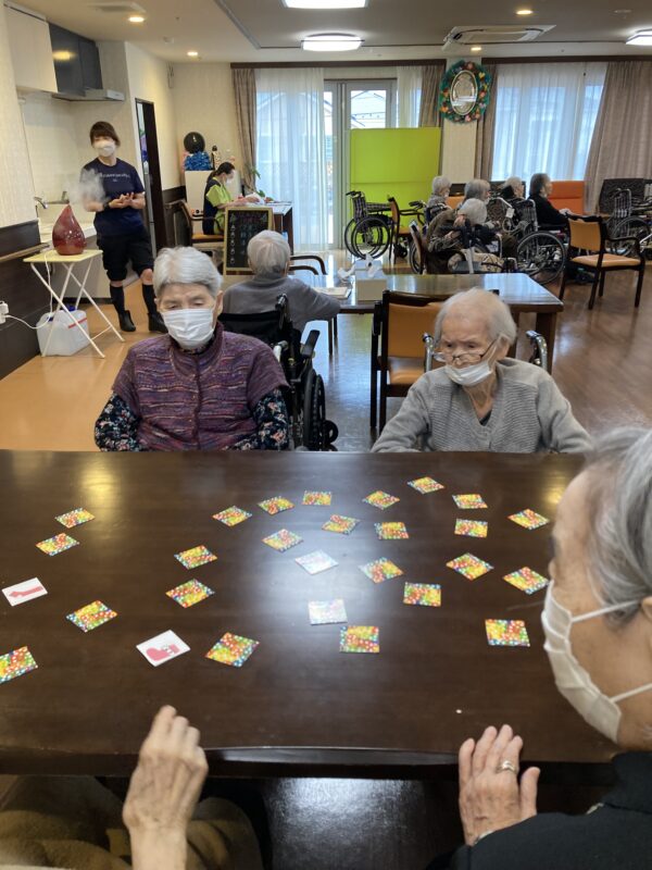 雨模様でしたが皆様は変わらずお元気でお過ごしです。本日は午前中は体操を行いました。午後からは日曜日恒例になった合同カラオケに参加したり、カードゲームをしたりして楽しく過ごされていました✨