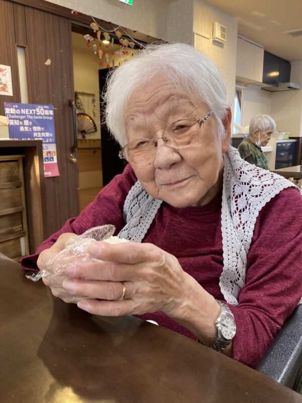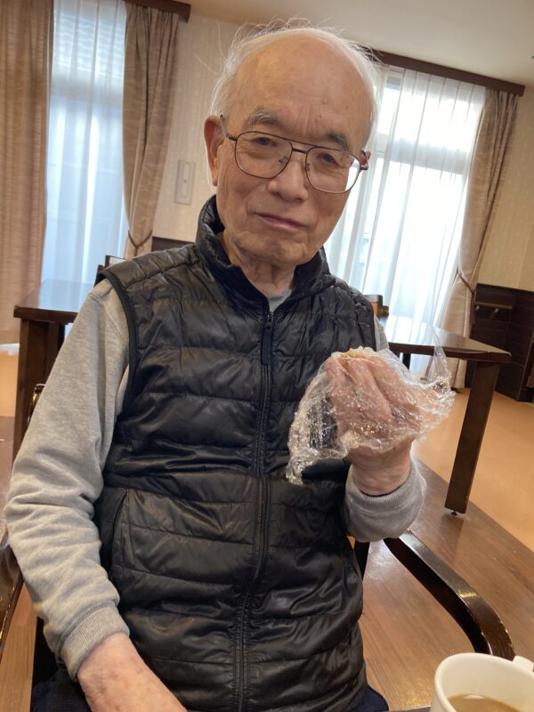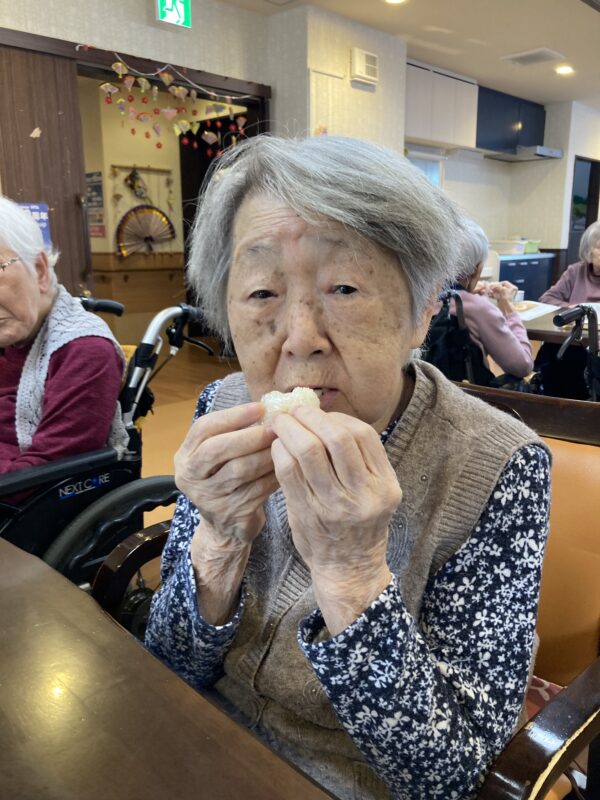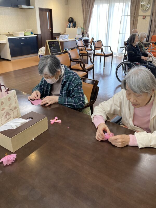 本日は午前中ははっきりしないお天気でしたが、午後からは良いお天気になり、皆様変わりなくお元気にお過ごしです。午前は体操をし、午後からは、春先取りで、桜の花の制作を行う人、時代劇を見る人、本を読む人それぞれに楽しく過ごされています。本日はバルコニーで出来たお米のおにぎりを召し上がりました。