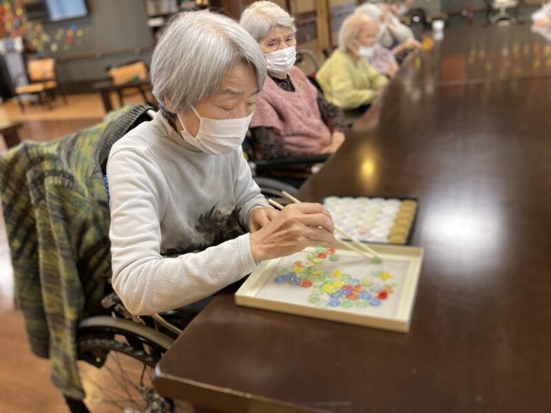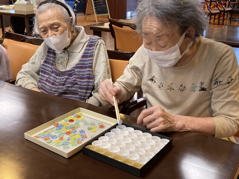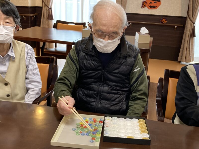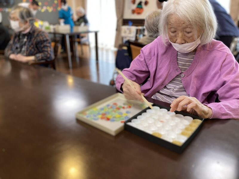 本日は気持ちの良い秋晴れの1日になりましたね🍂!! アクティビティでは、、 『お箸でおはじきをペットボトルキャップに移すゲーム』をしました🤗✨大変な盛り上がりで楽しい時間を過ごしました!!