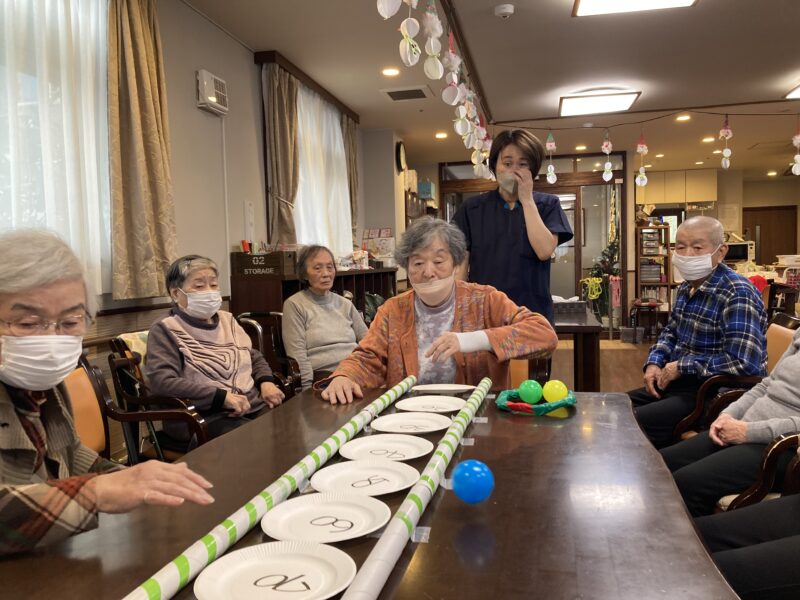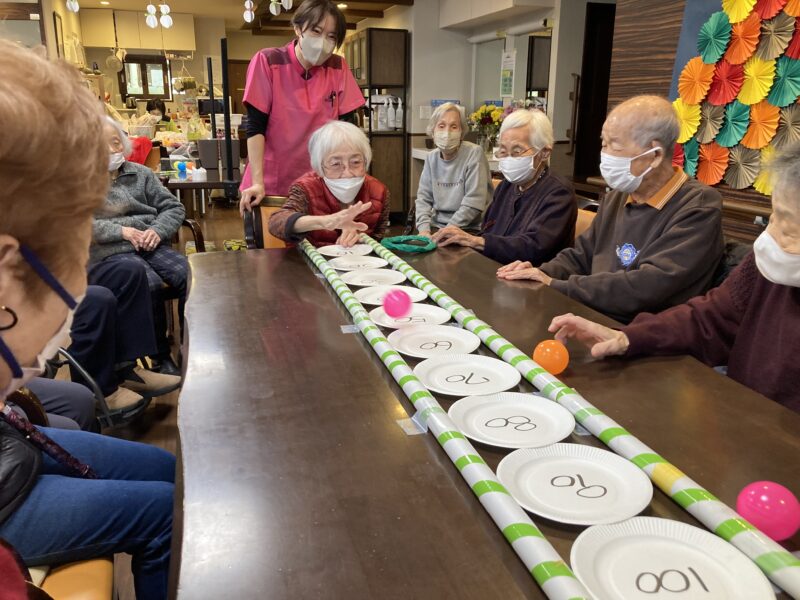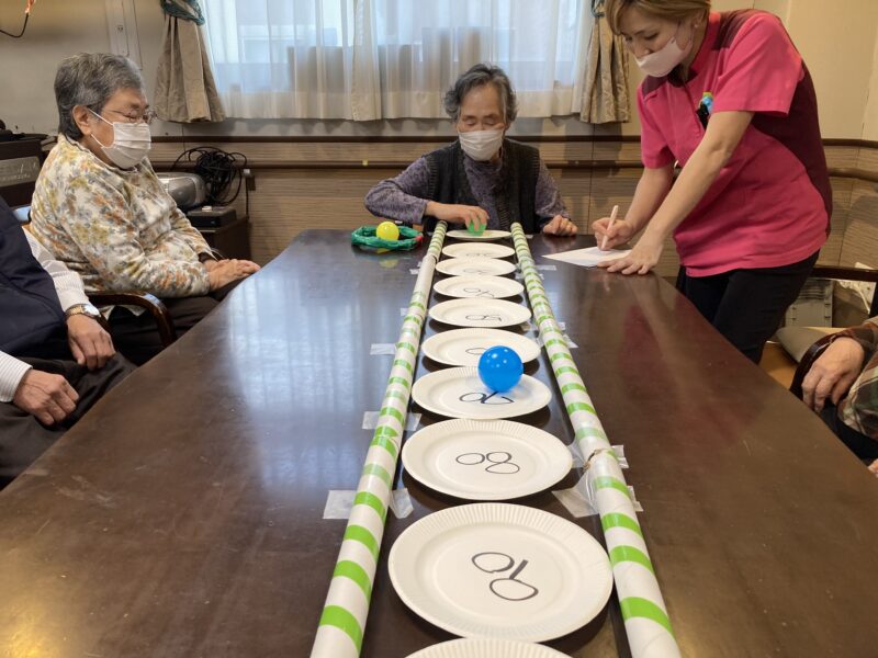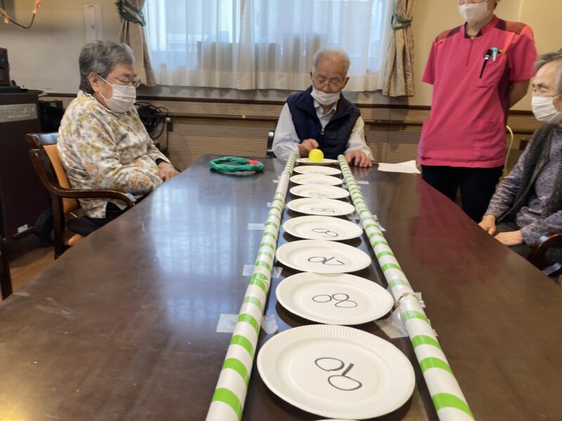 テーブルに点数をつけたお皿を並べてボールを転がすゲームです!!