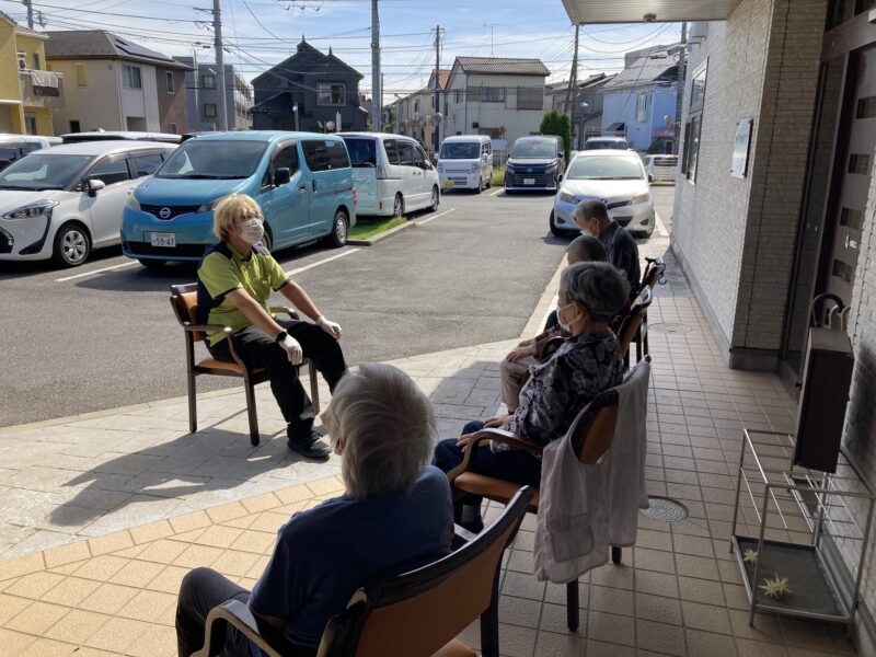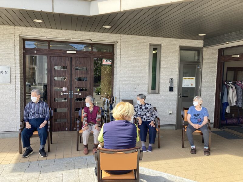 いつもの機能訓練も外に椅子を出して
