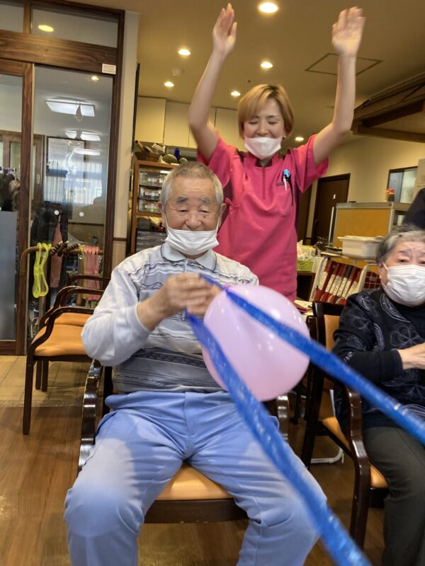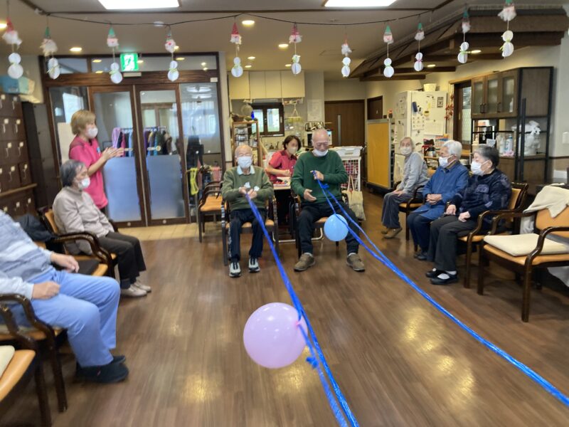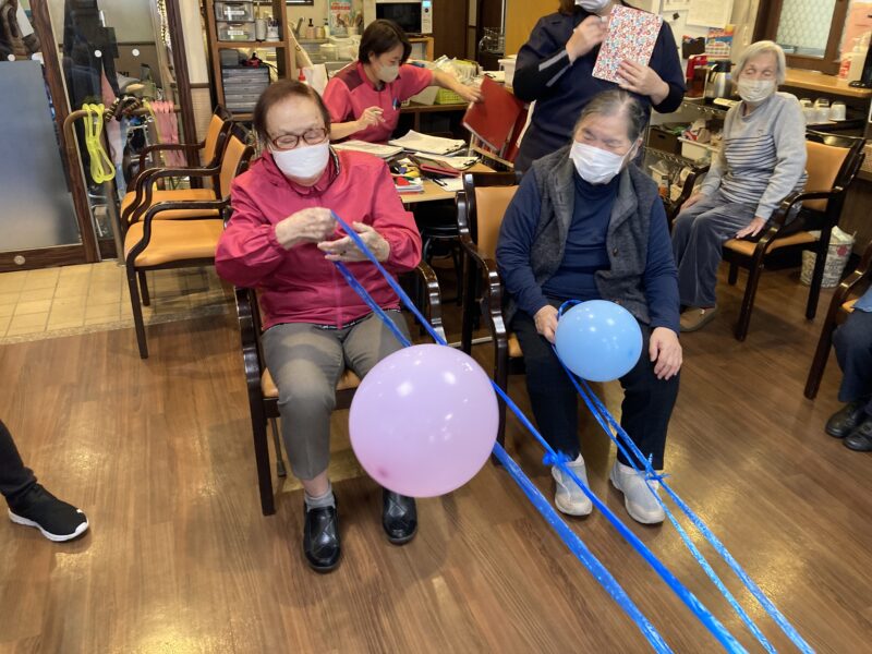 長いヒモに風船をつけ一周させ早く自分の手元に戻す!という