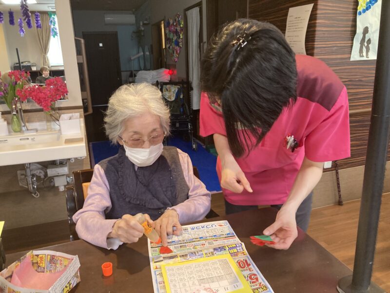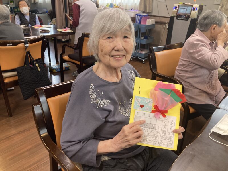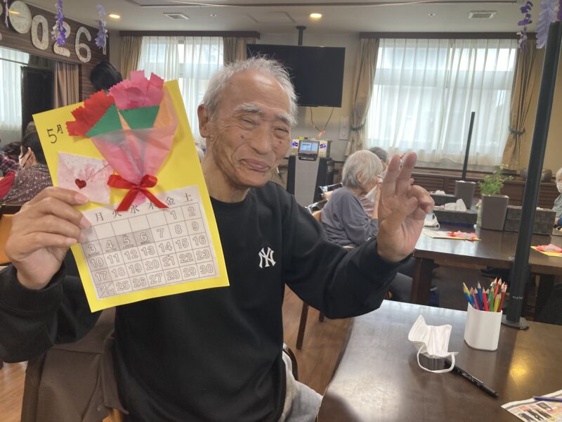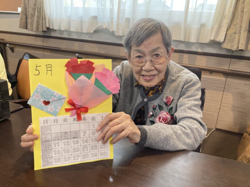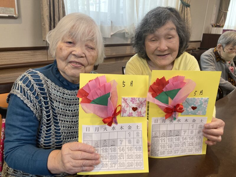 5月のカレンダーは母の日をイメージして赤とピンクの2色のカーネーションを作っていただきました💐