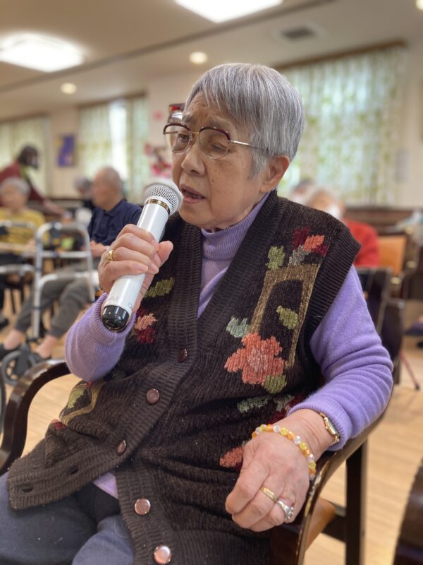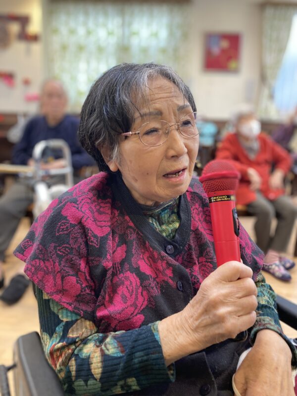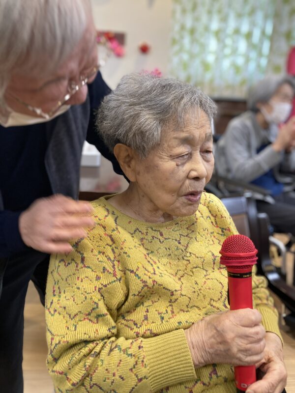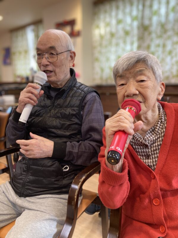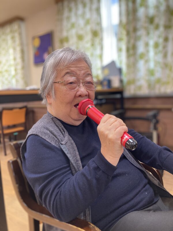 週末のカラオケ大会も2階との合同で行う事が多くなり、盛り上がっています。マイクを持たない人でも知っている歌だと声を出して歌って楽しまれています。