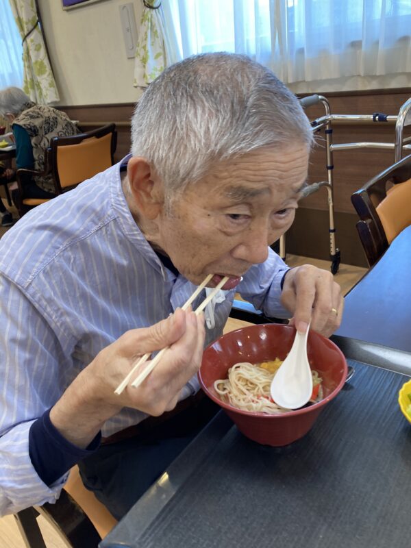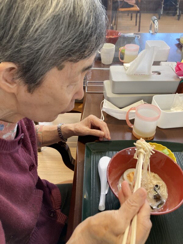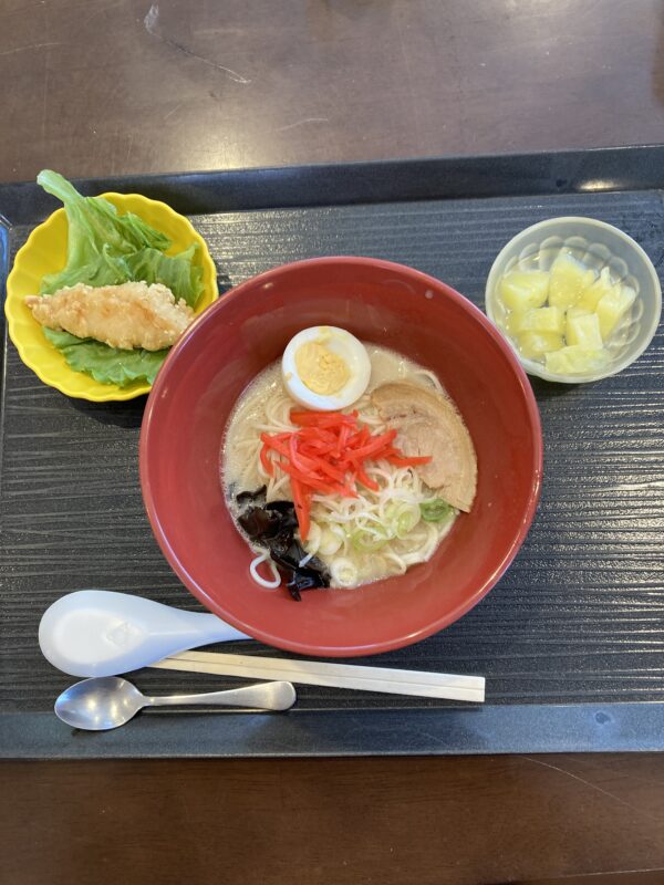 本日の昼食は、とんこつラーメンでした。何故か、『とんこつラーメンです。』とメニューを読み上げると、うわっわーと歓声が上がっていました。皆様美味しそうに、召し上がってくださいました。