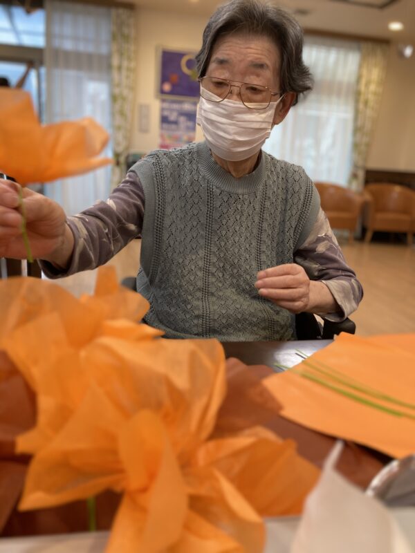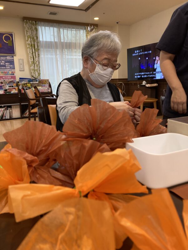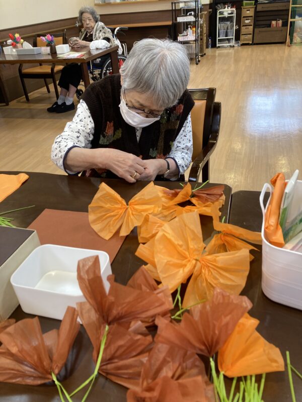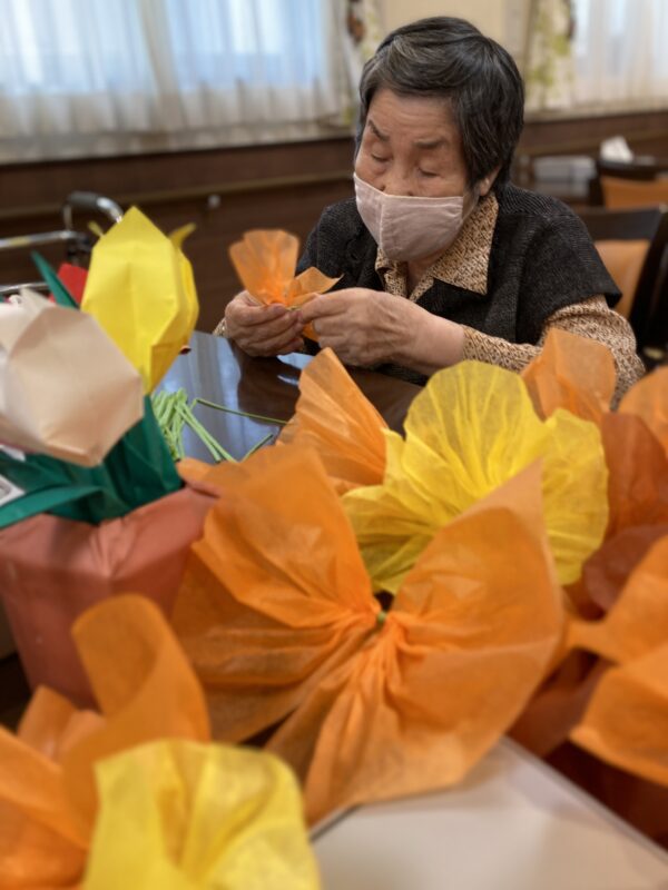 本日は午前中に体操を行い午後は皆様で作品作りをしていただきました。お隣と作品を見せ合いそういうやり方いいわね 丁寧に作っているわね 性格が出るわねと笑い声が響き楽しくお話をしながらあっという間にお花の山ができました。