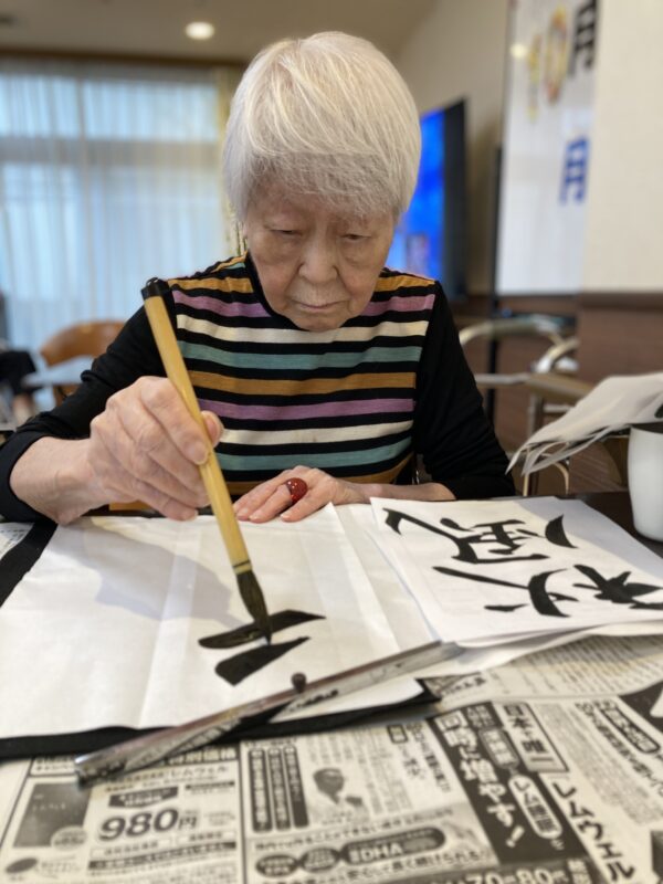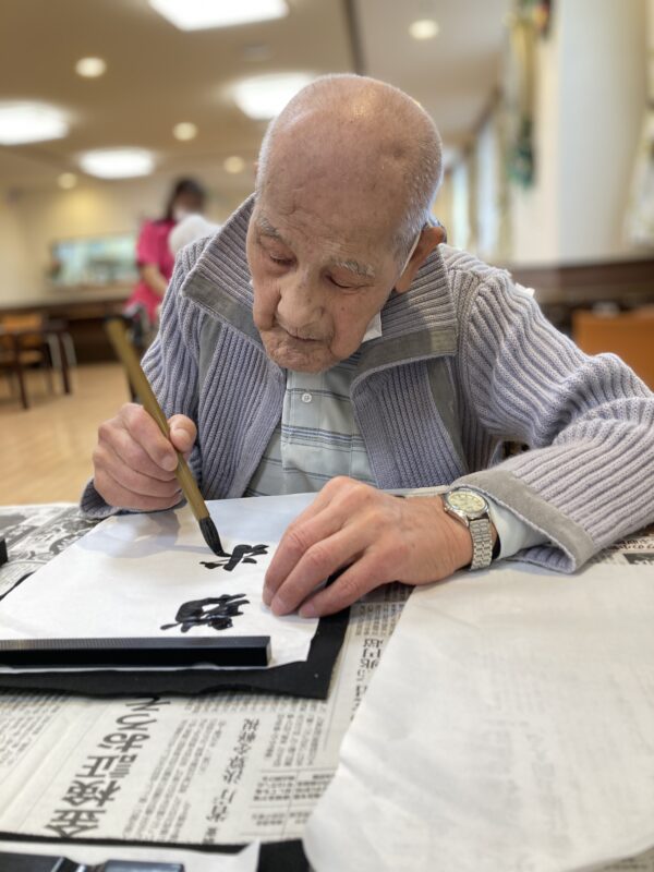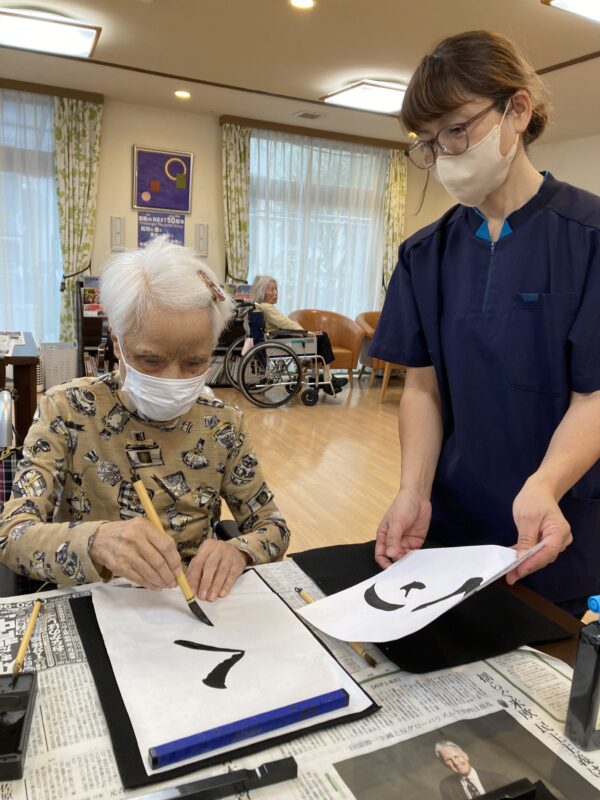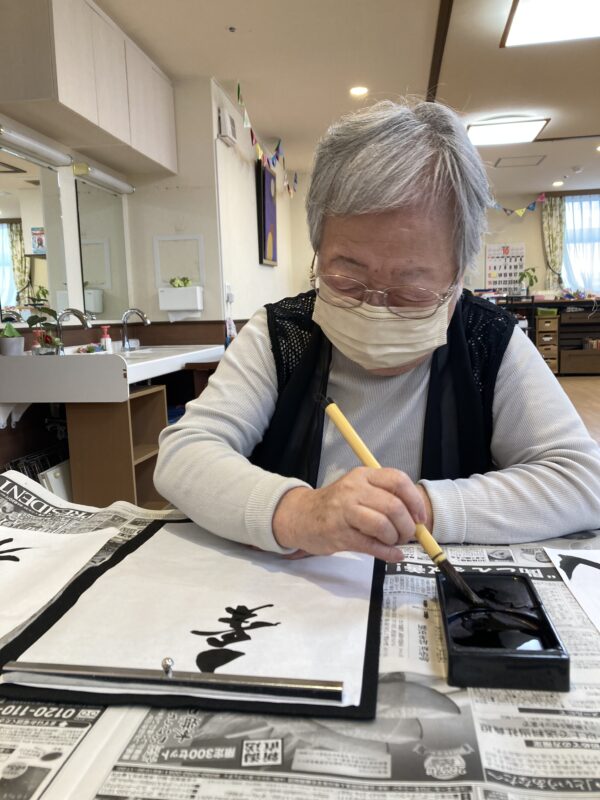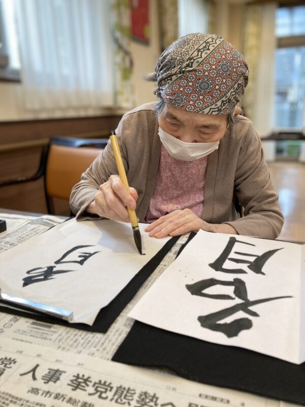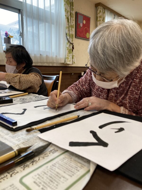 本日は曇り空のすっきりしないお天気でしたが、皆様笑顔で午前中は体操や脳トレを行い、午後はお習字を行いました。皆様集中して納得いくまで何枚も書かれていました。