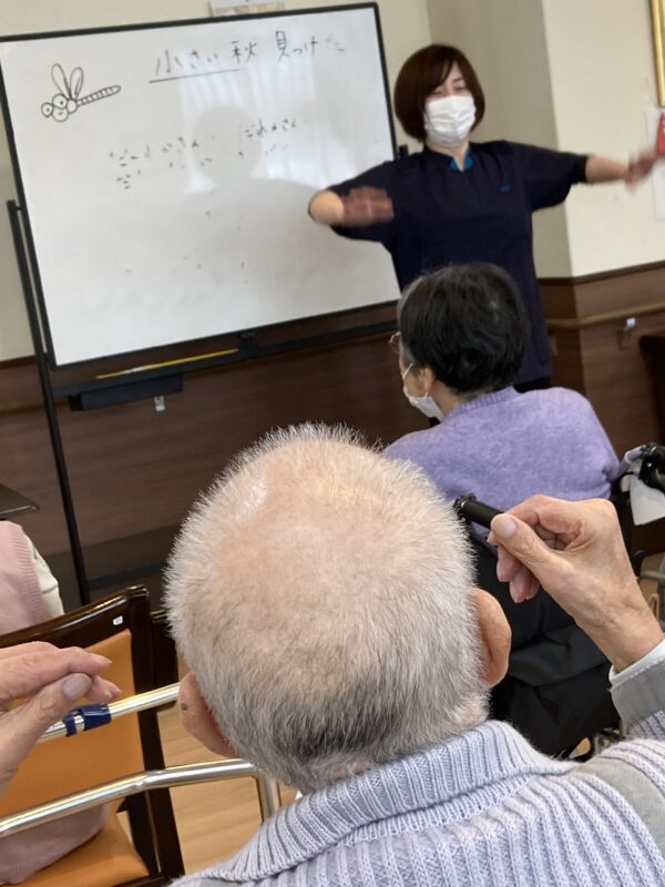 午前中のアクティビティは脳トレ、体操、歌詞の穴埋めを行なってから季節の歌『小さい秋』を歌いました。