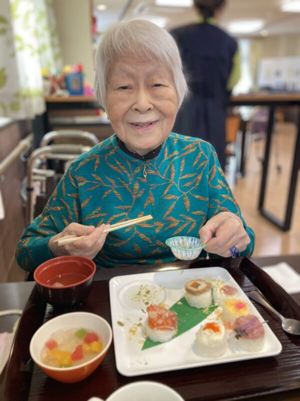 昼食は節分メニュー。かわいいお寿司に「わぁー美味しそう!」と歓声が上がっていました。