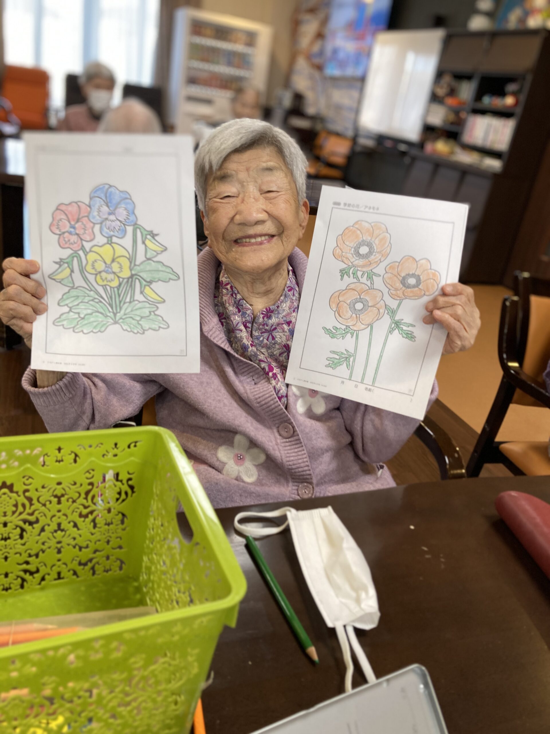 本日は、花の塗り絵に取り組んでいただきました🌸 「どの色にしようかな?」と悩みながら、思い思いの色を選び、皆さま集中して塗られていました🎨✨ 完成した作品はどれも個性豊かで、テーブルの上が一気に華やか[...]