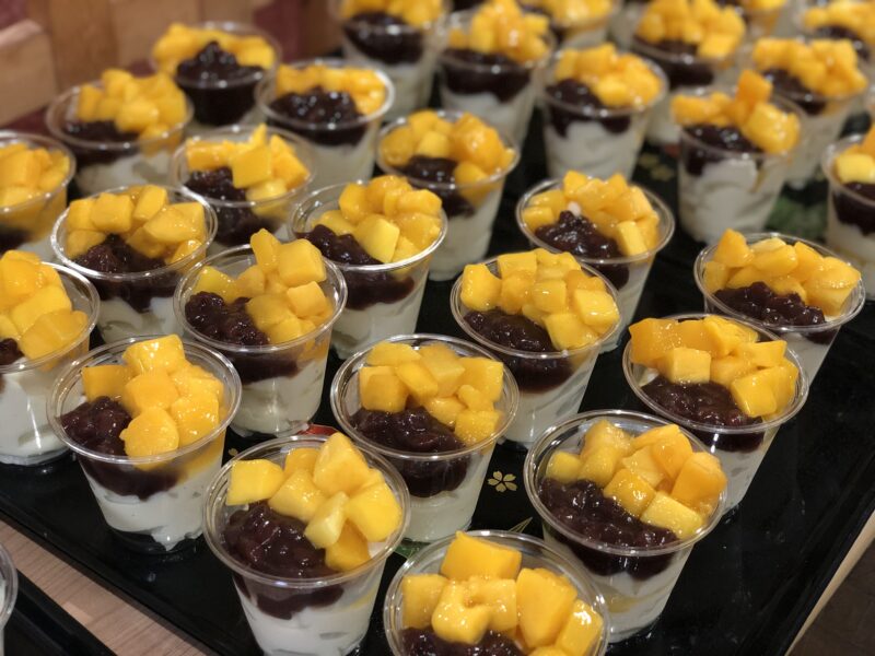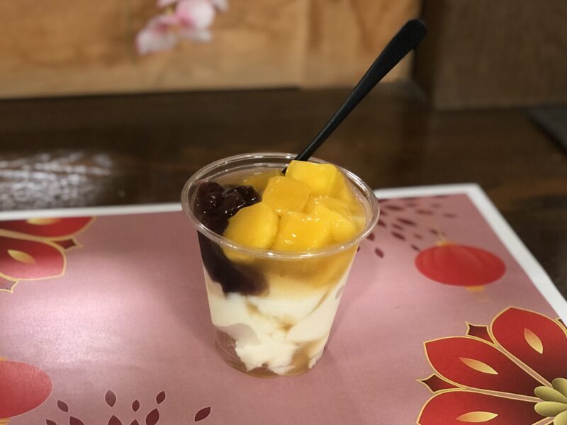 デイサービスの手作りご当地おやつは、「豆花(トウファ)」です。で小豆とマンゴーをトッピングして、きび糖シロップをかけて提供しました。つるんとした食感とさっぱりした甘さが絶品でした😊