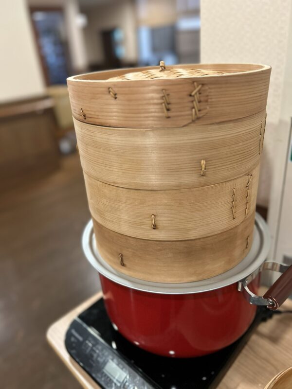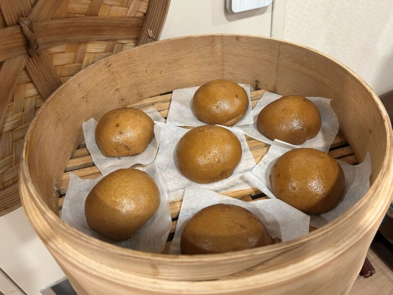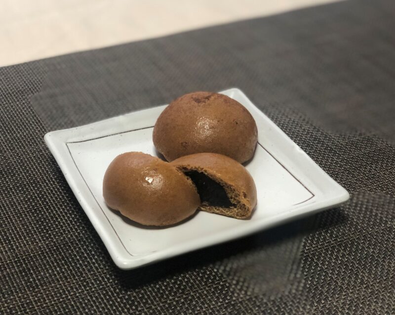 黒糖入りの生地を作り、あんこを中にいれて形を整えて蒸し上げました。
