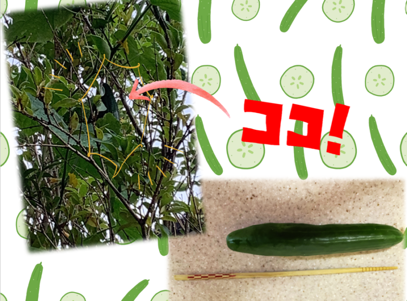 酷暑で成長が芳しくなかったきゅうりなのですが、ふと上を見上げると木の上にきゅうりが!😲