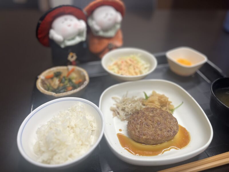 今日の昼食はハンバーグです。ユニットにお邪魔して写真をパチリ。📷お味はどうですかと尋ねると、「やわらかくて美味しいですよ」と話してくださいました。