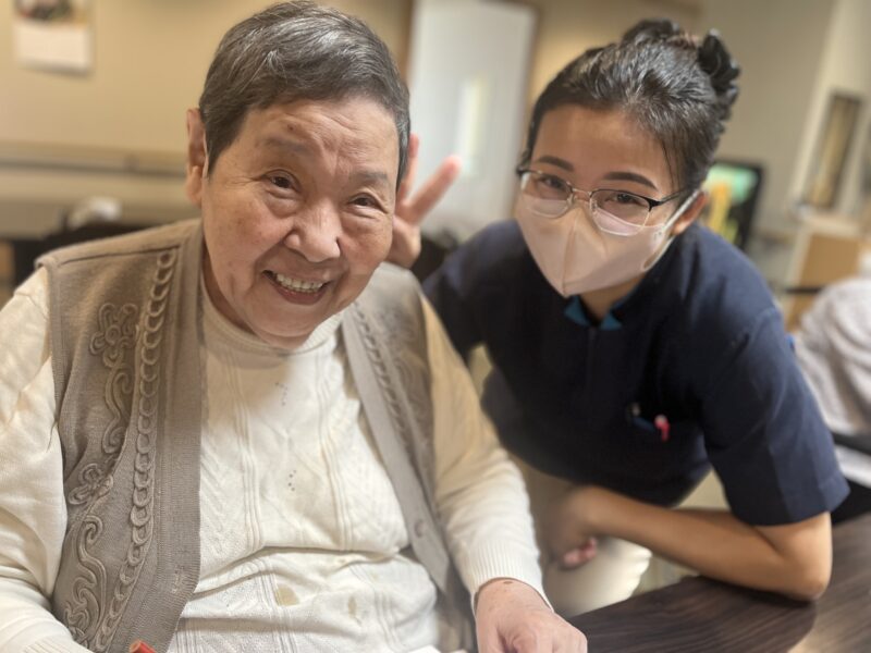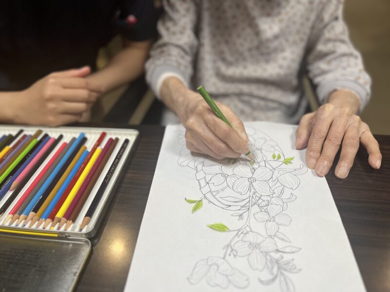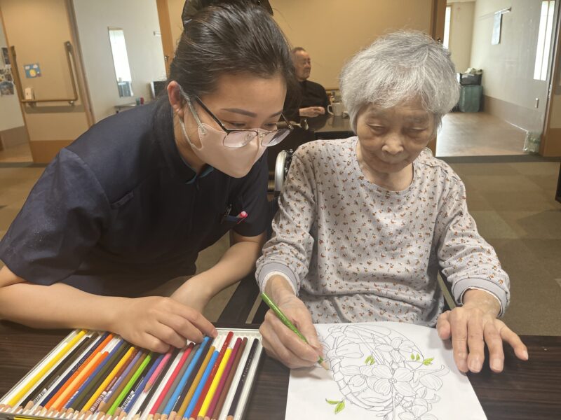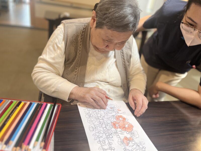 熱心に塗り絵をしている入居者をパチリ。お花、葉を丁寧に塗られてました。🌸🌸🌸「色を決めるのが難しいね」と話されてました。職員が「この色はどうですか」と話をすると「きれいな色ね」と笑顔で話してました。(^^♪