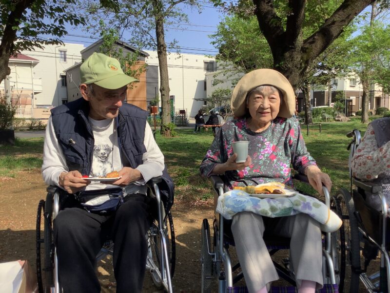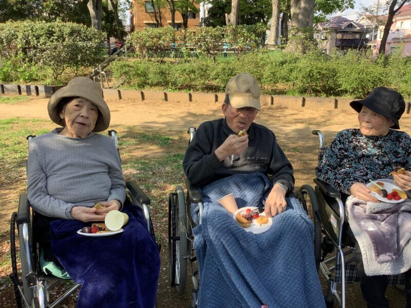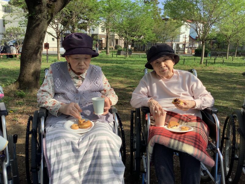 今日は元渕江公園にみんなで行きました。どら焼きやジュースをもっておやつを食べて楽しい時間を過ごしました。