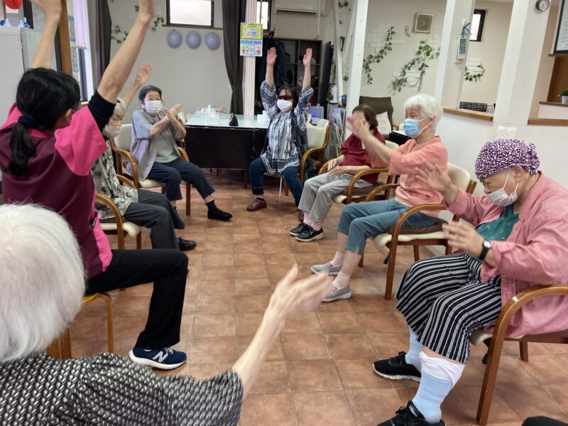 体操では身体を大きく動かしました!2の倍数でバンザイしたり、5の倍数では自分をハグしたり!