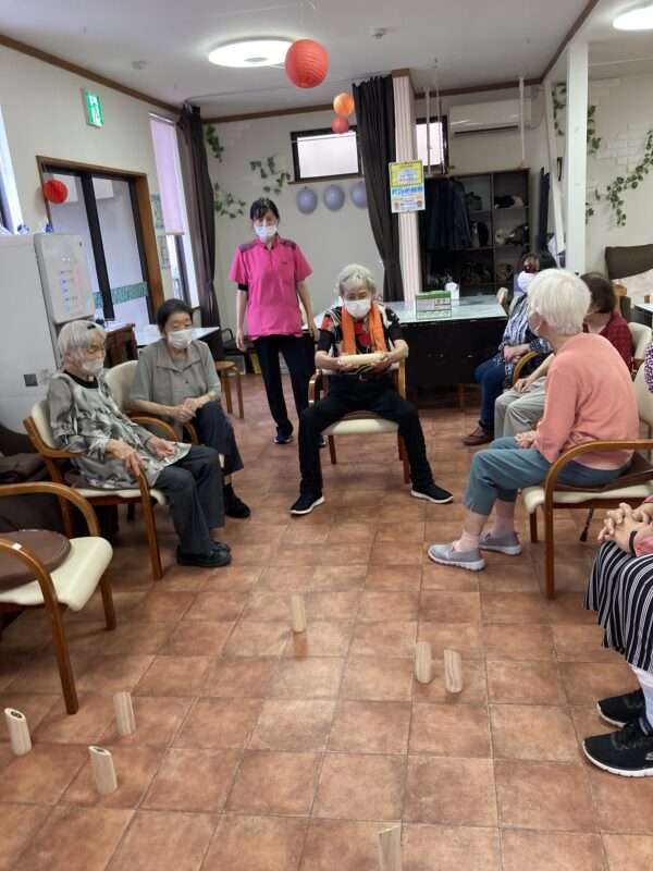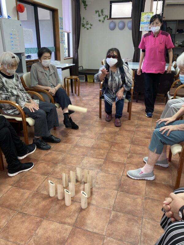 数字の書いてある木のピンを木のスティックを投げて倒します!本日はチーム戦で盛り上がりました(^^♪