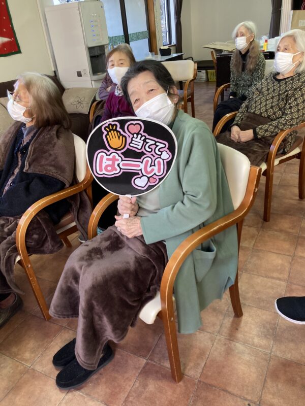 リクエストしたいとき、当ててほしいとき、アピールしたいですね!今日は職員が作ったうちわでチャレンジ!何度も名前を呼んでいただけましたね♪