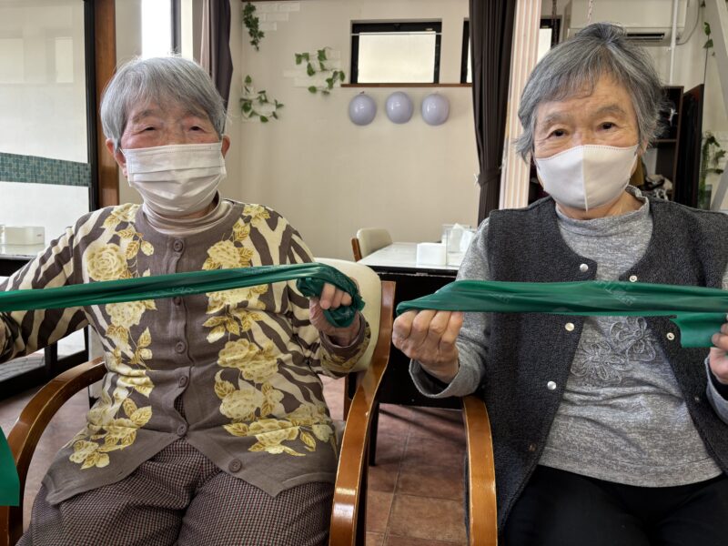それでは、セラバンド運動をやりましょう(^^)/セラバンドは、短く持つか長く持つかで負荷が変わります!