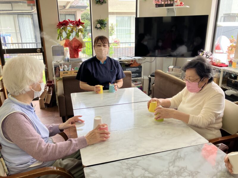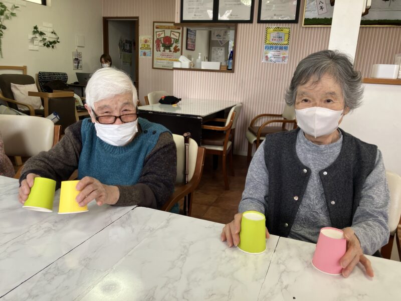 本日の午前中のアクティビティは「リズムカップス」です!紙コップを両手に持ってリズムに乗って動かしましょう!