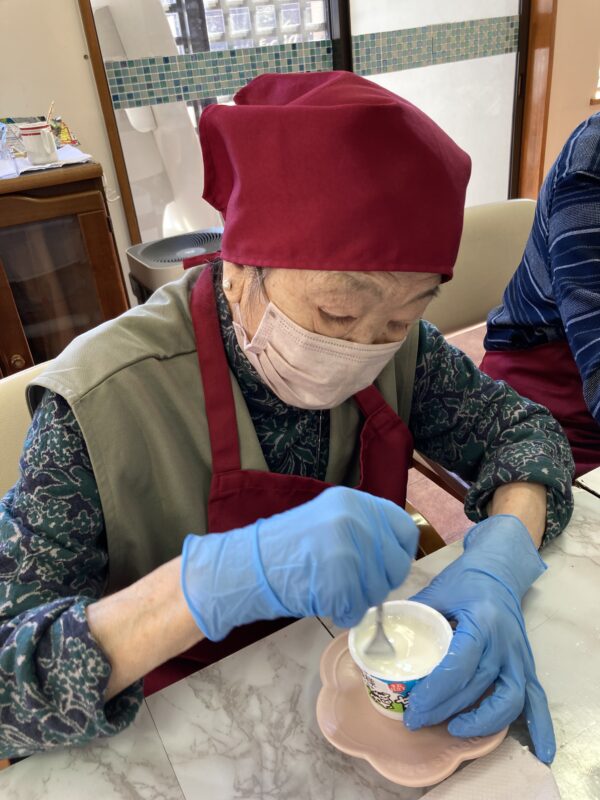 本日はレアチーズケーキ作りをしました!まずは、おひとりずつヨーグルトを滑らかになるまでしっかり混ぜます!