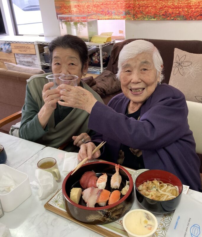 昼食は、お寿司・かき揚げうどん・茶碗蒸しをご用意して皆様と一緒にお祝いしました。