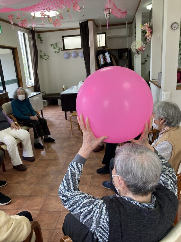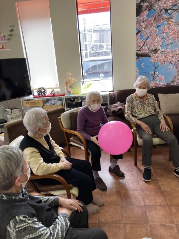 皆さま円になって、大きなピンク色の風船を使ってキャッチしたり、相手のお名前を呼んで風船をポーンと放ったりしました。